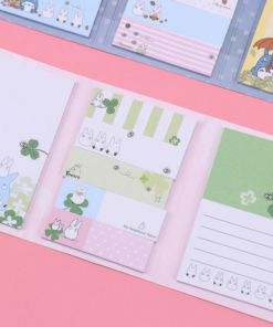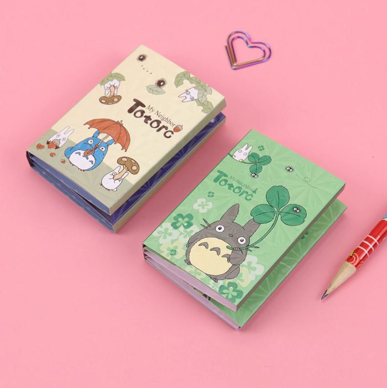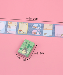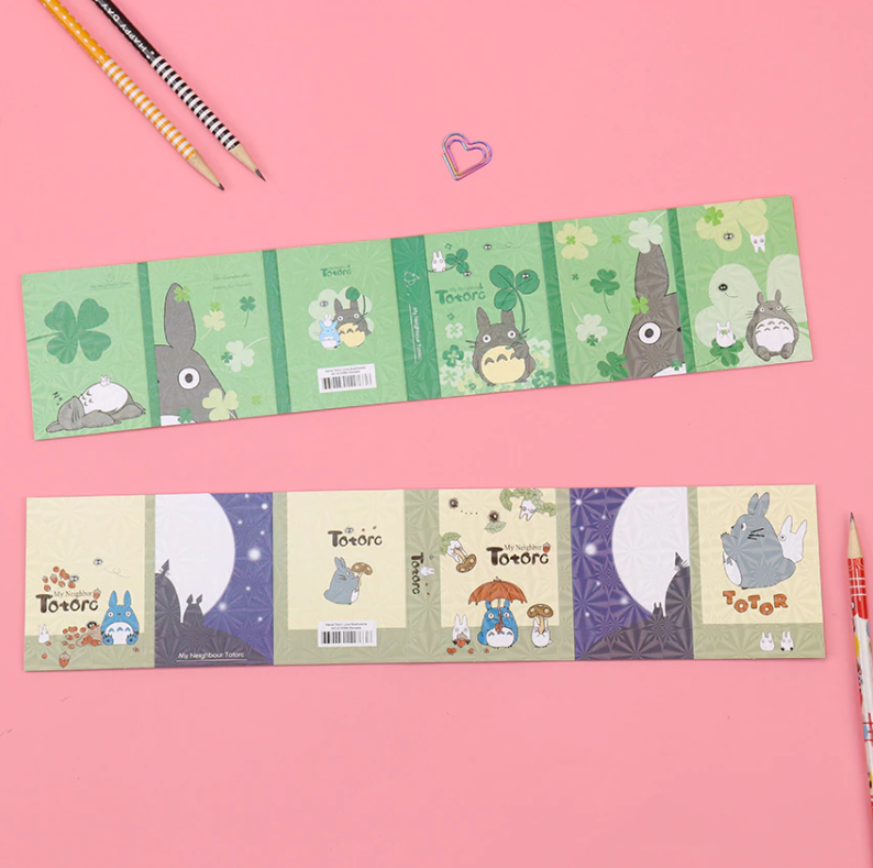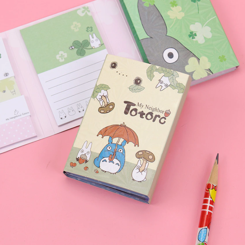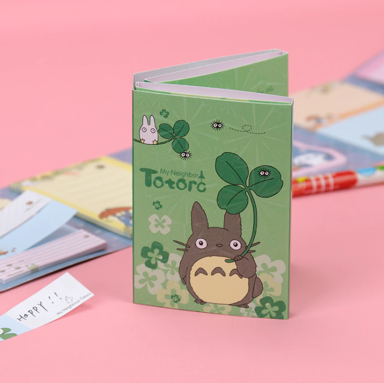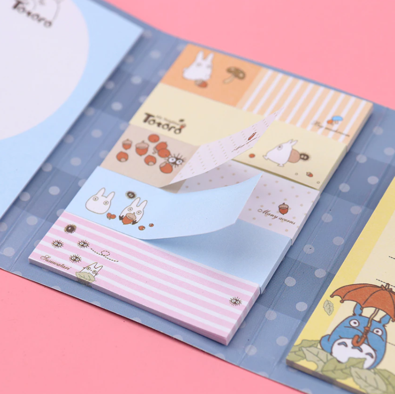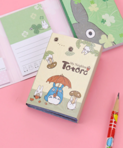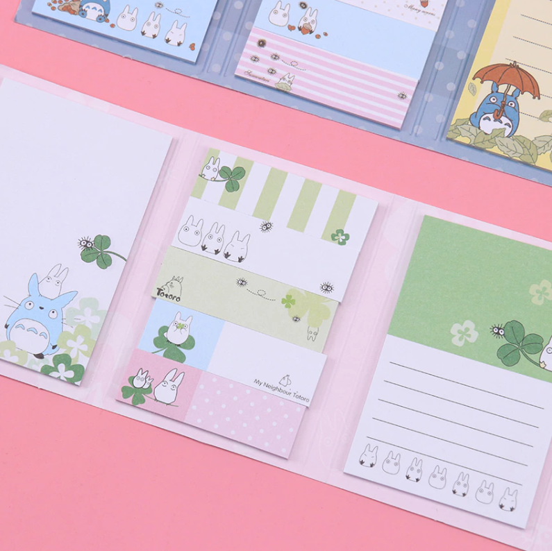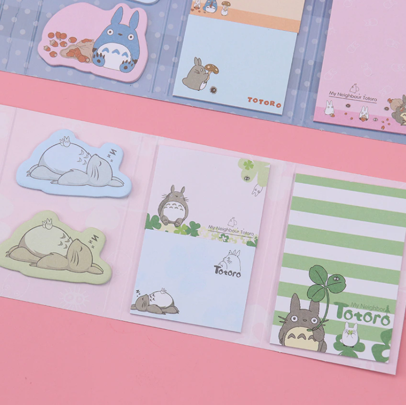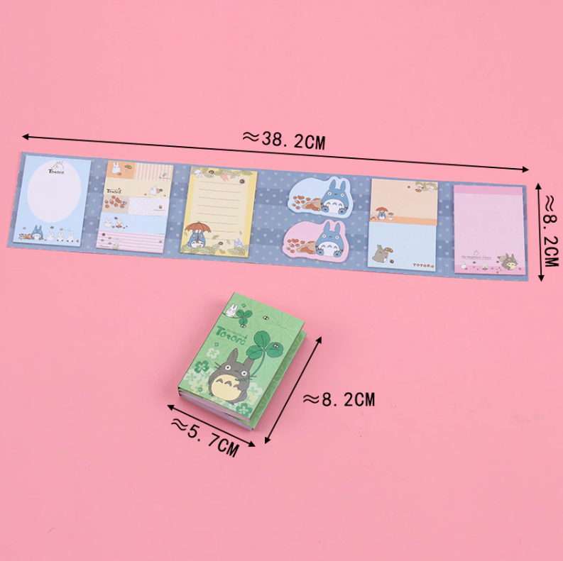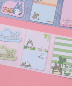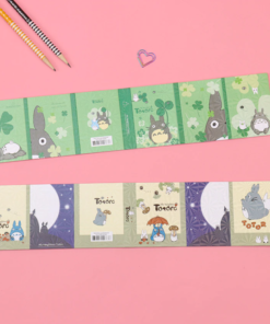 Lepiace papieriky rôznych rozmerov a druhov so vzorom obľúbenej Japonskej postavičky Totoro v malej knižke. V knižke sa nachádza 12 rôznych dizajnov nalepovacích poznámkových bločkov.