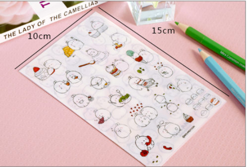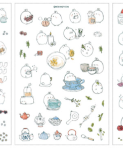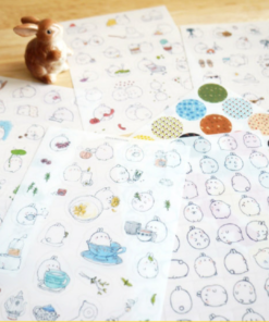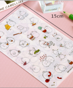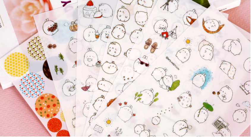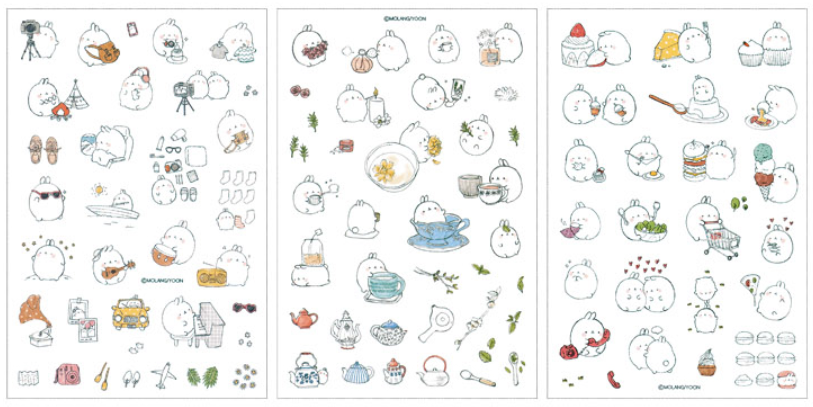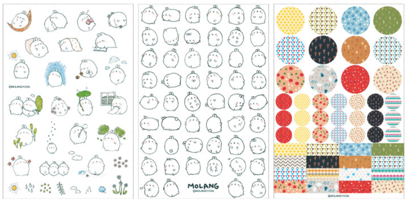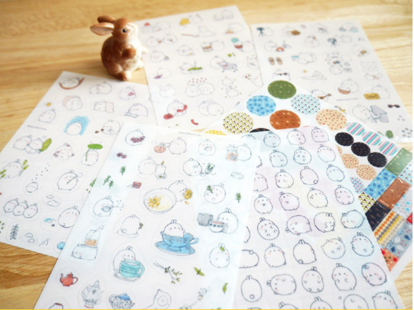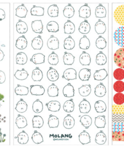 6x hárok s nálepkami so vzorom zajačika Molang. Rozmery hárku sú 10×15 cm.